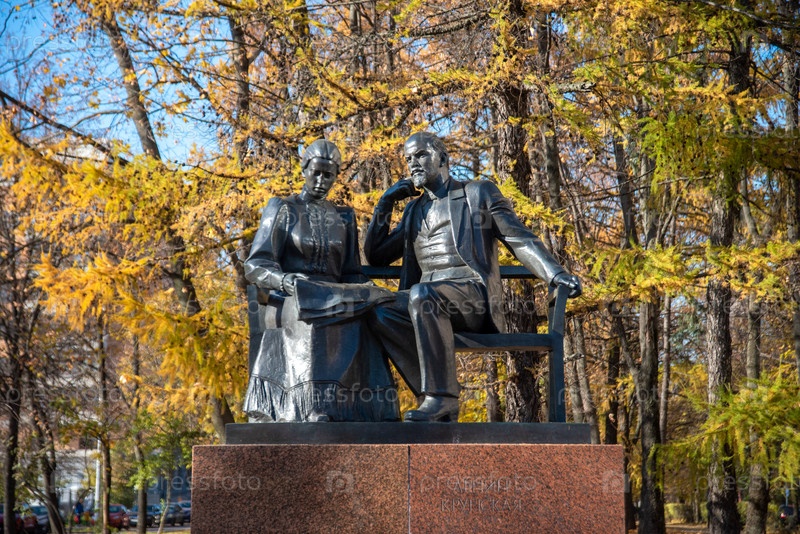 Москва, Россия - 11 октября 2021 г.: Памятник известному русскому революционеру Владимиру Ленину и его жене Надежде Крупской