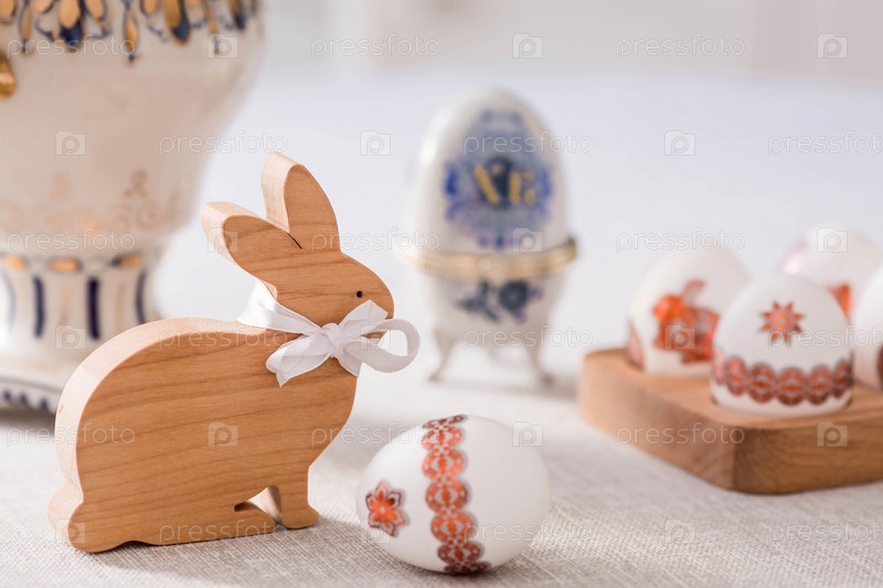 Большая яичная коробка с надписью XB, пасхальный кролик и пасхальные яйца на льняной салфетке на столе