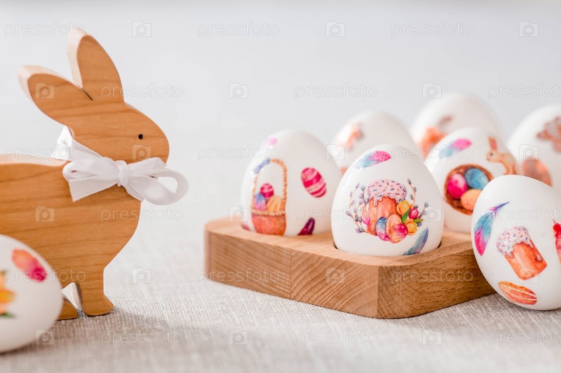 Деревянный пасхальный кролик с бантом и пасхальными яйцами на льняной скатерти на столе. Концепция праздника Светлой Пасхи