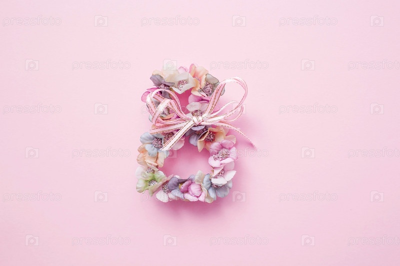 Международный женский день. Баннер, флаер, красивая открытка на 8 марта. Цветы в форме цифры восемь на розовом фоне