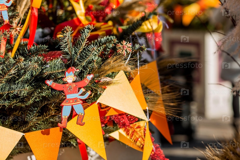 Московские сезоны. Украшения на Тверской улице в честь празднования традиционного русского праздника Масленица. Изображение игрушки-петрушки на елке с разноцветными лентами