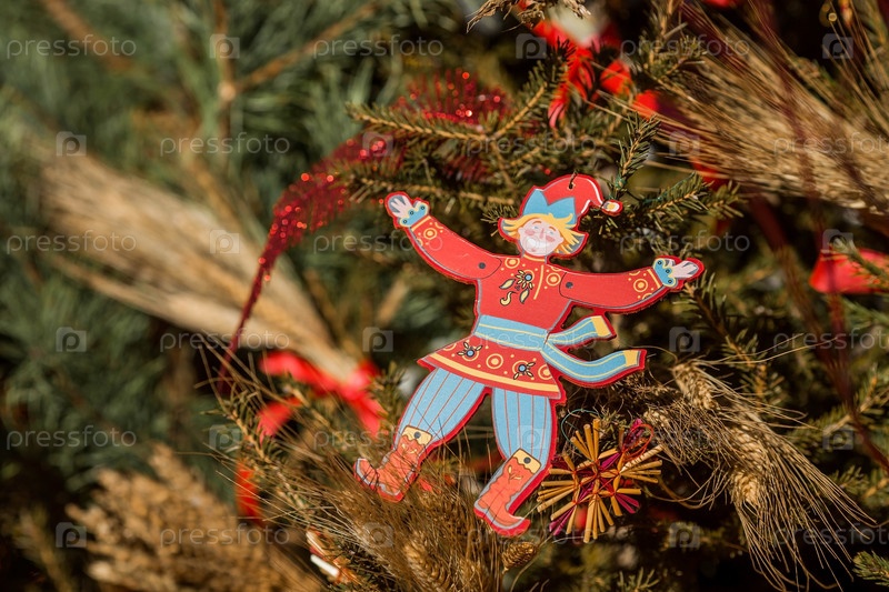 Московские сезоны. Украшения на Тверской улице в честь празднования традиционного русского праздника Масленица. Изображение игрушки-петрушки на елке с разноцветными лентами