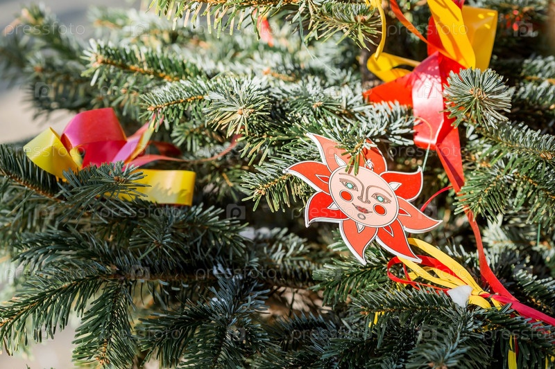 Московские сезоны. Украшения на Тверской улице в честь празднования традиционного русского праздника Масленица. Изображение Солнца на елке с разноцветными лентами