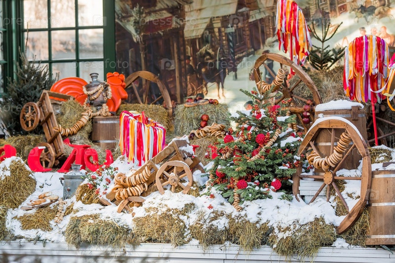 Московские сезоны. Украшения на Тверской улице в честь празднования традиционного русского праздника Масленица. Телеги, телеги, сено, бочки, самовары, бублики, баранки и елочки с разноцветными ленточками