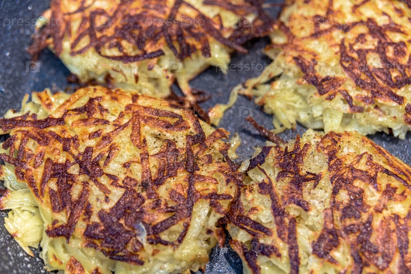 Оладьи из картофеля на сковороде, хорошо прожаренные. Концепция еды