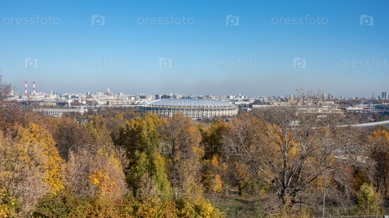 Москва, Россия - 11 октября 2021 г.: Панорамный вид на стадион "Лужники" с Воробьевых гор на фоне городских пейзажей в осенний солнечный день