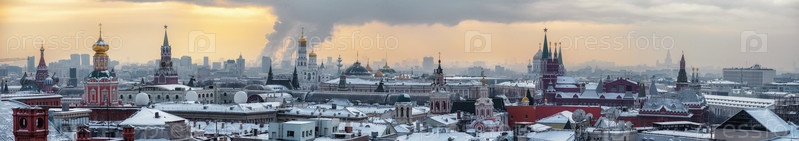Панорама исторического горизонта города Москвы зимой. Снежное здание, кремлевские башни Красной площади, Московский университет, церкви и соборы, здание правительства и крыши других московских зданий присутствуют на красивом воздушном городском пейзаже