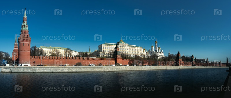 Панорамный вид на Московский Кремль с Софийской набережной над рекой. Россия, Москва ранней весной