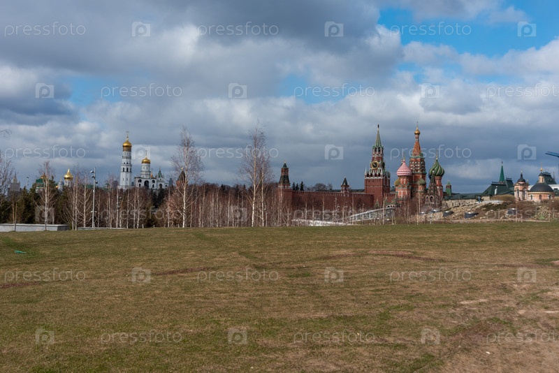 Живописная панорама парка Зарядье с видом на собор Василия Блаженного и Московский Кремль, Россия. Вид на достопримечательности Москвы весной. Красивые пейзажи Центрального парка Москвы