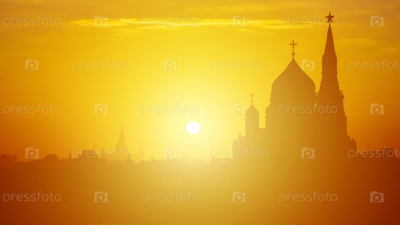 Вид на закат на Московский Кремль и Москву-реку в Москве, Россия. Архитектура и достопримечательность Москвы, городской пейзаж Москвы