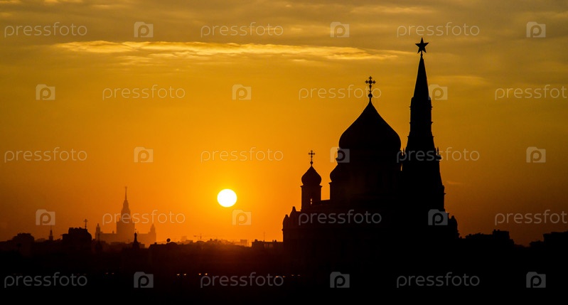 Вид на закат на Московский Кремль и Москву-реку в Москве, Россия. Архитектура и достопримечательность Москвы, городской пейзаж Москвы