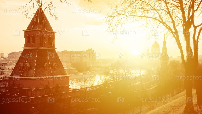 Вид на закат на Московский Кремль и Москву-реку в Москве, Россия. Архитектура и достопримечательность Москвы, городской пейзаж Москвы