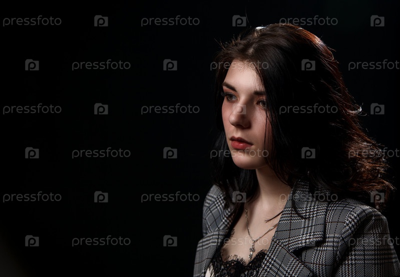 Портрет молодой красивой брюнетки в деловом костюме в студии на черном фоне