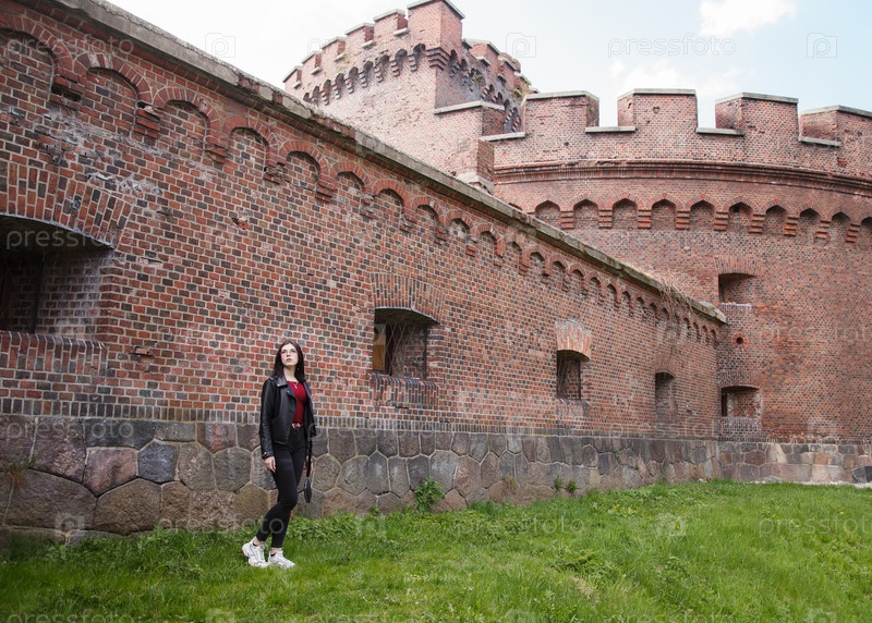 Молодая красивая девушка в черной куртке и джинсах стоит возле старой крепостной стены в солнечный день