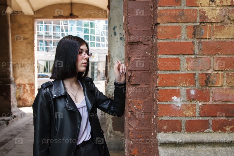 Грустная молодая девушка в черной куртке и джинсах стоит в старой арке на городской улице в летний день. крупным планом открытый