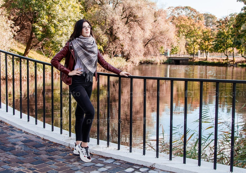 Молодая девушка в коричневой куртке и черных джинсах стоит на мосту у реки в городском парке в солнечный осенний день