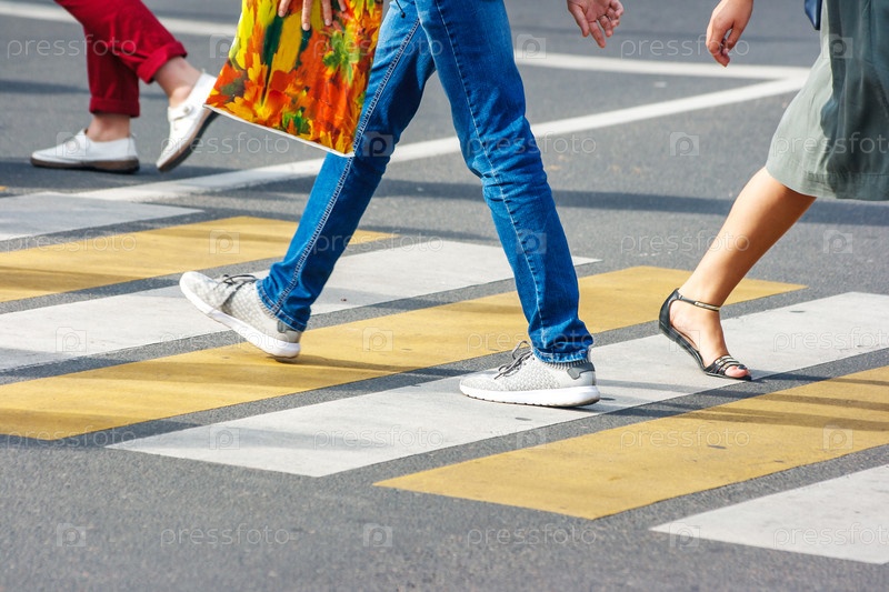 Ноги людей, пересекающих пешеходный переход на оживленной улице