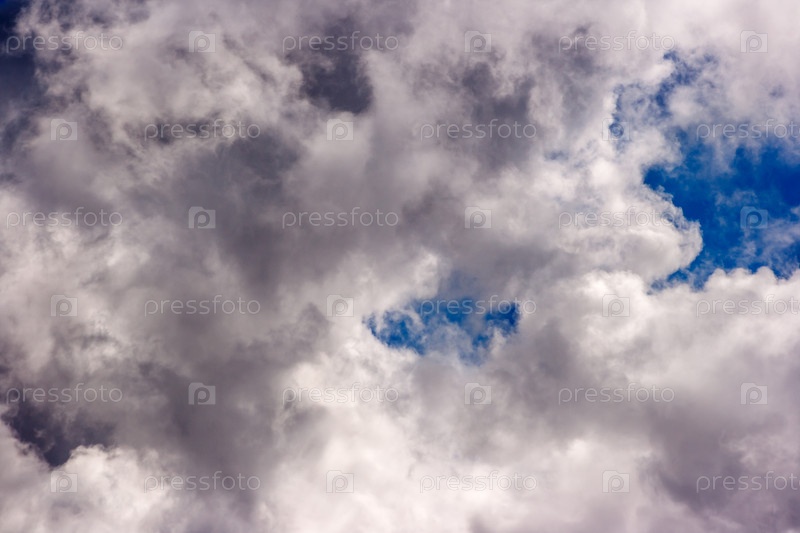 Плотные и большие белые облака на красивом летнем голубом небе