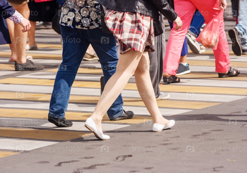 Ноги пешеходов на пешеходном переходе в летний день