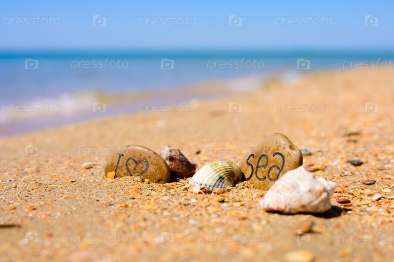 Камешки с надписью Я люблю море на пляже у моря. Рядом с галькой лежат несколько ракушек. Концепция морского путешествия