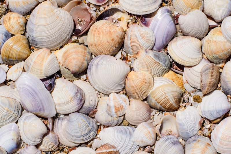 Фон из ракушек. Пляж из ракушек крупным планом. Вид сверху