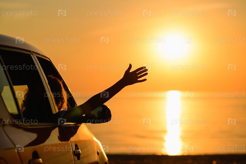 Девушка в машине на закате на фоне моря. Рука девушки на фоне солнца на пляже. Автопутешествие к морю