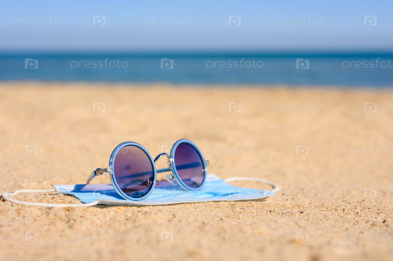 Солнцезащитные очки лежат на медицинской маске на песчаном пляже на фоне синего моря. Концепция отдыха во время пандемии