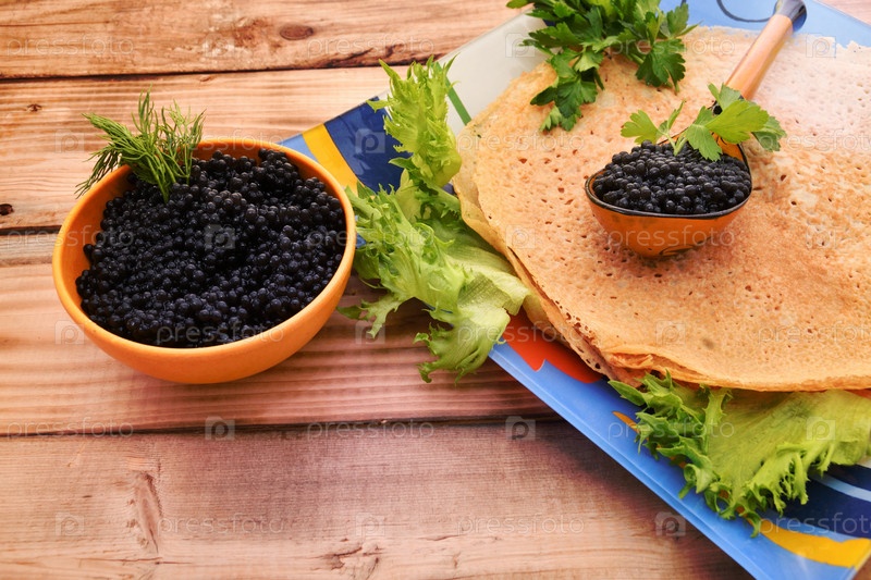 Блины с черной икрой, приготовленные на Масленицу