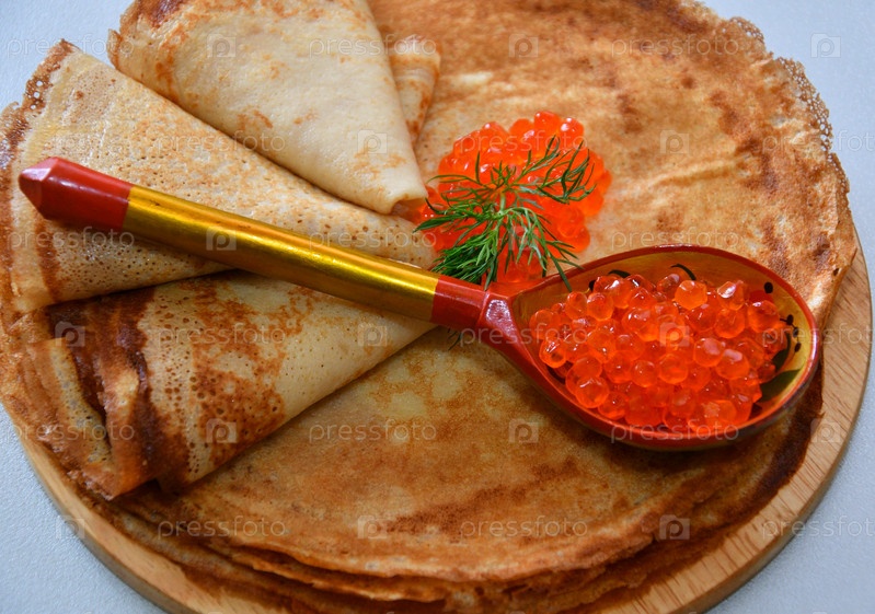 Блины с красной икрой, приготовленные на Масленицу