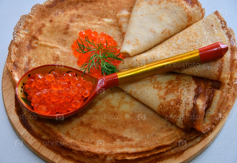 Блины с красной икрой, приготовленные на Масленицу