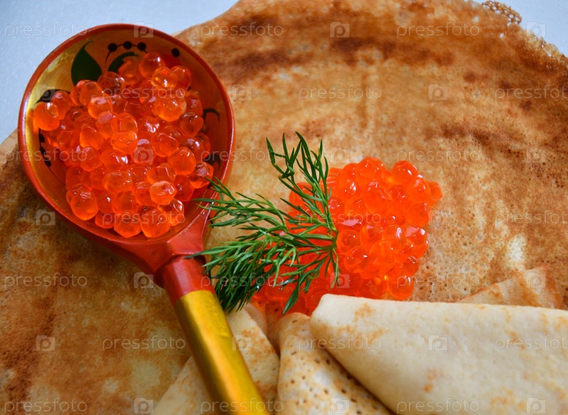 Блины с красной икрой, приготовленные на Масленицу