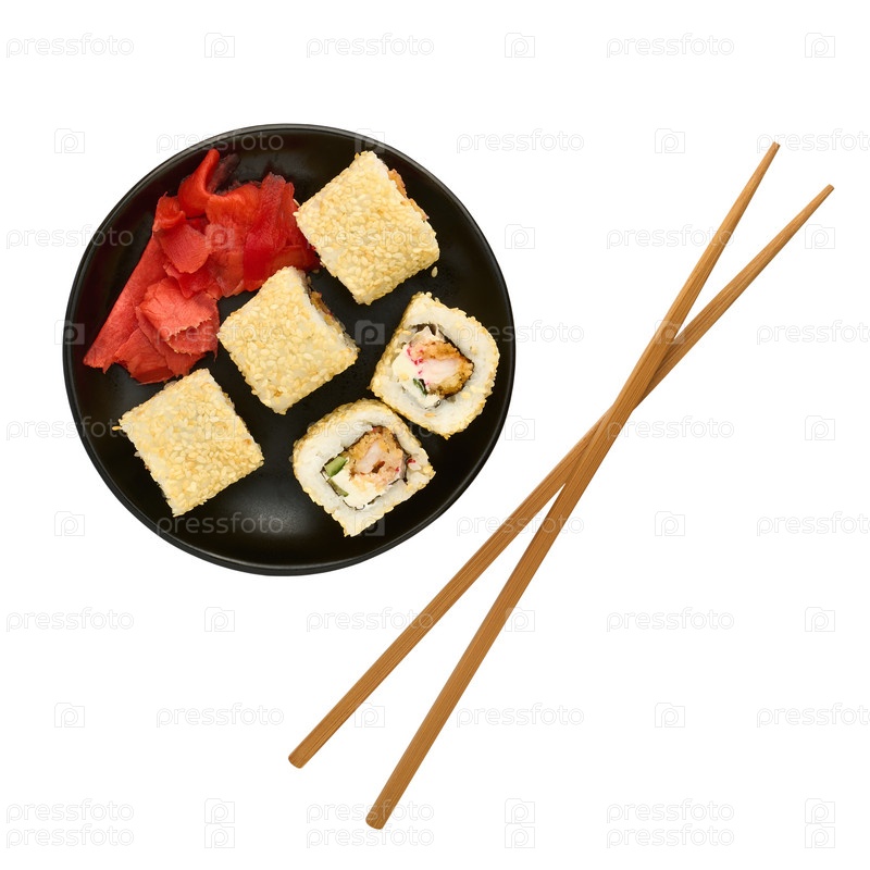 Японская еда, суши-роллы, имбирь и палочки для еды на белом фоне, плоская планировка
