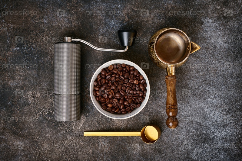 Предметы для приготовления кофе по-турецки, плоская планировка, вид сверху, крупный план