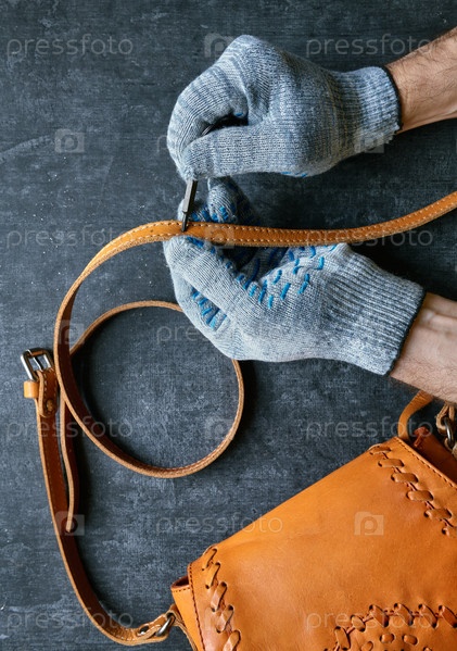 Мастер по коже ремонтирует кожаную сумку, вид сверху, крупным планом