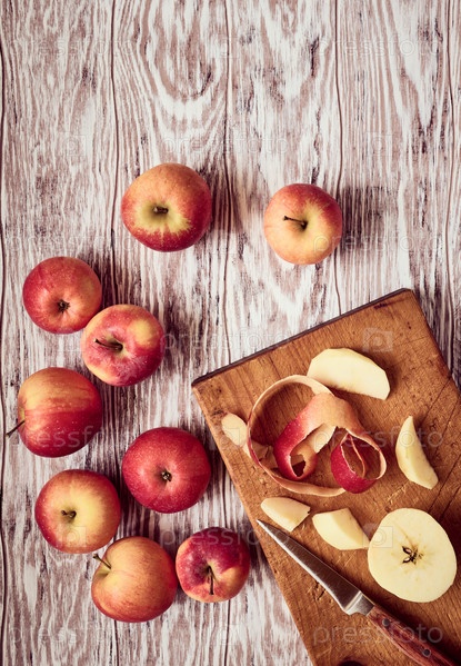 Сочные красные яблоки и завиток яблочной кожуры, лежащий на деревянном столе, стилизованный, вид сверху