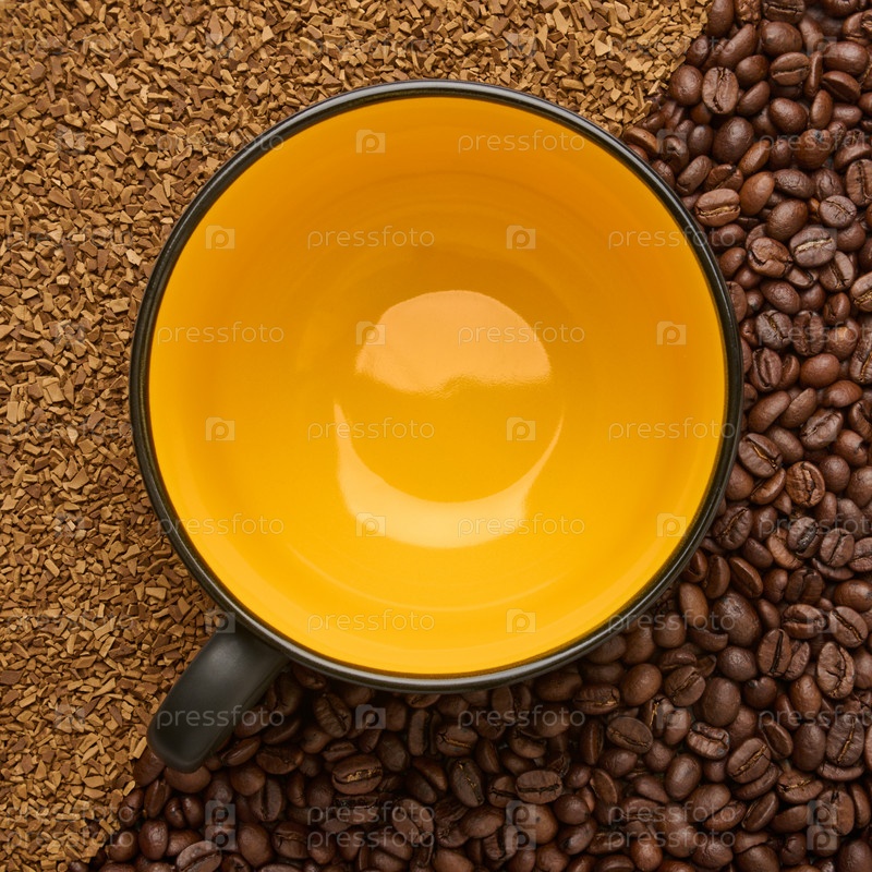 Большая пустая керамическая чашка на фоне сублимированного и бобового кофе