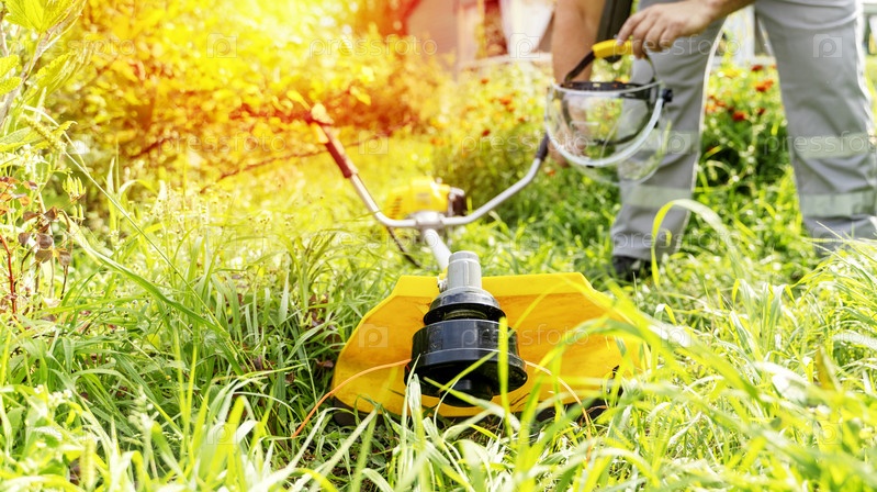 Мужчина косит траву триммером