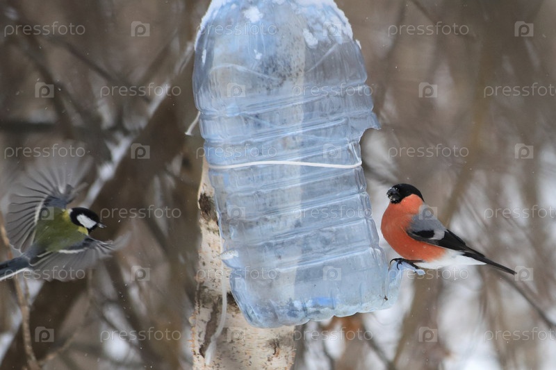 Снегирь зимой около кормушки