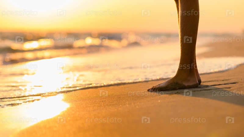 Ноги на фоне красивого заката на берегу моря. Сосредоточьтесь на ногах. Есть место для текста
