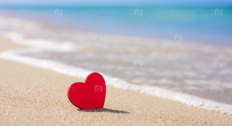 Красное сердечко стоит на песчаном пляже. На заднем плане морская волна