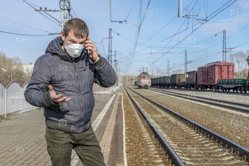 Очень злой мужчина стоит на вокзале и разговаривает по телефону во время пандемии коронавируса среди поездов
