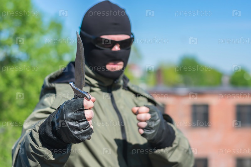 Уличный бандит угрожает ножом и показывает на прохожих указательным жестом
