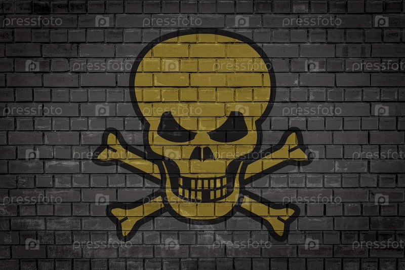 Угрожающий череп, изображенный на темной кирпичной стене как предупреждение об опасности
