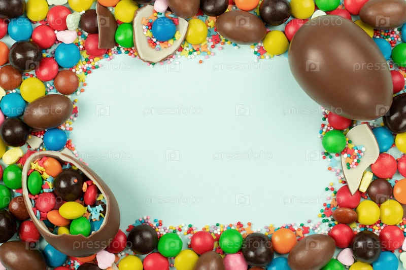 Рамка из шоколадных яиц и красочных сладостей на голубом фоне. Концепция детского праздника, дня рождения или счастливой Пасхи. Место для текста