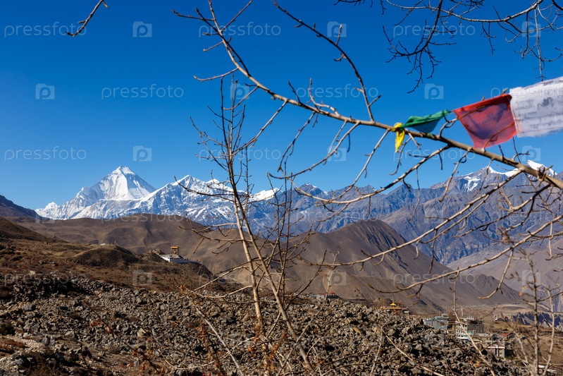 Осенний пейзаж, деревня Муктинатх с Гималаями Дхаулагири