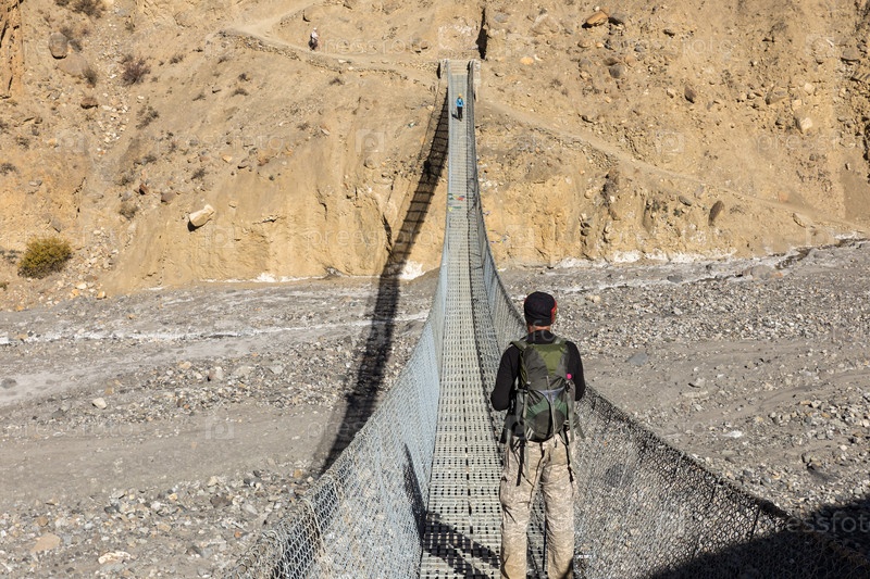 Мужчина с рюкзаком стоит на подвесном пешеходном мосту через горное ущелье и смотрит на горы. Непал. Гималаи