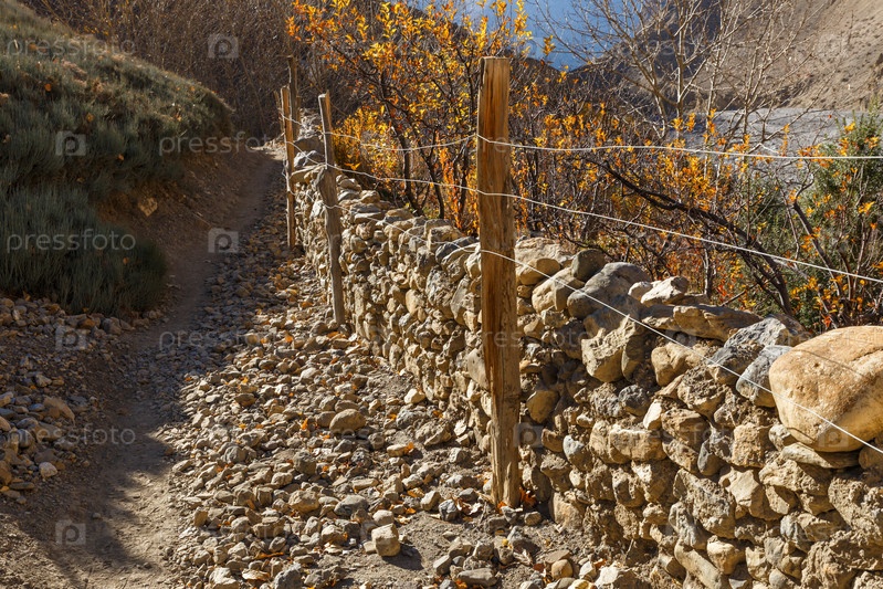 Горная тропа, заборная сетка и камень, Гималаи, Непал