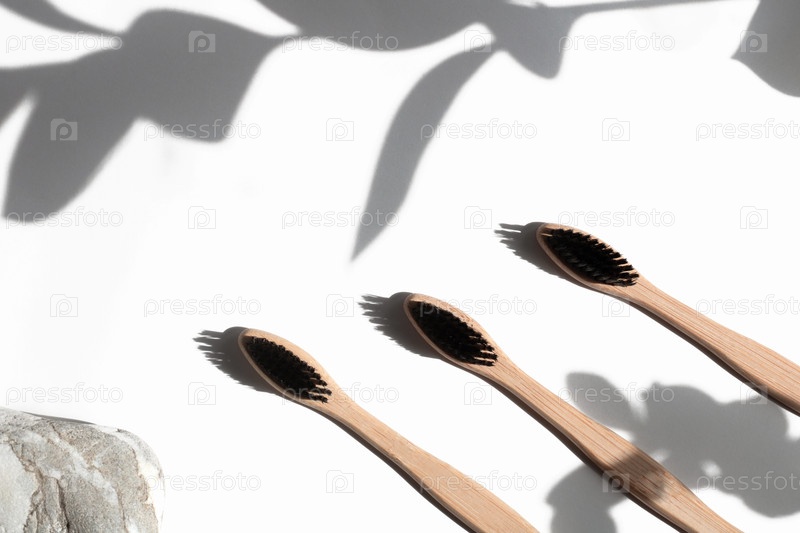 Бамбуковые зубные щетки изолированы на белом бетонном фоне с тенями растений. Концепция личной гигиены, стоматологии, безотходности, экологичности. Копировать пространство
