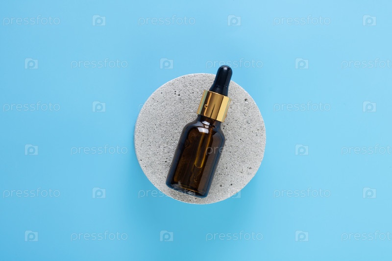 Смоделируйте стеклянную бутылку-капельницу на бетонном каменно-сером подиуме, на голубом фоне. Минимализм. Вид на Срерху