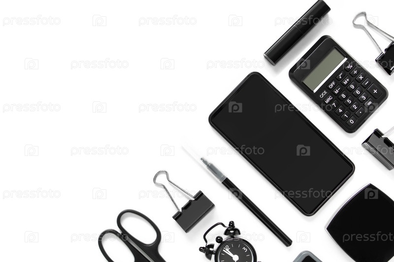 Коллекция офисных аксессуаров черного цвета на белом фоне с копировальным пространством. Смартфон, калькулятор, будильник, ножницы, помада, часы. Вид сверху. Деловая квартира лежала